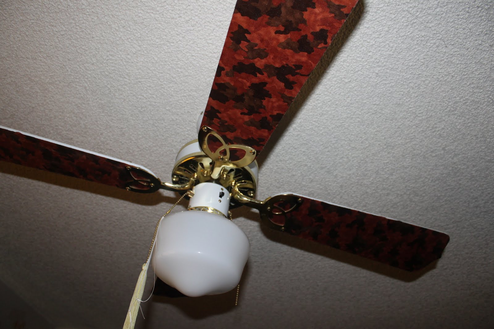 After it is dry take your very sharp scissors and poke the holes that the screws go through on the blade, then add your hardware back to the fan blade. If you have an ugly gold fan like I do, you could also spray paint the hardware, I decided that I like the ugly gold next to the brown camo so I left it. But if you paint it, do so before putting it back together. :-)